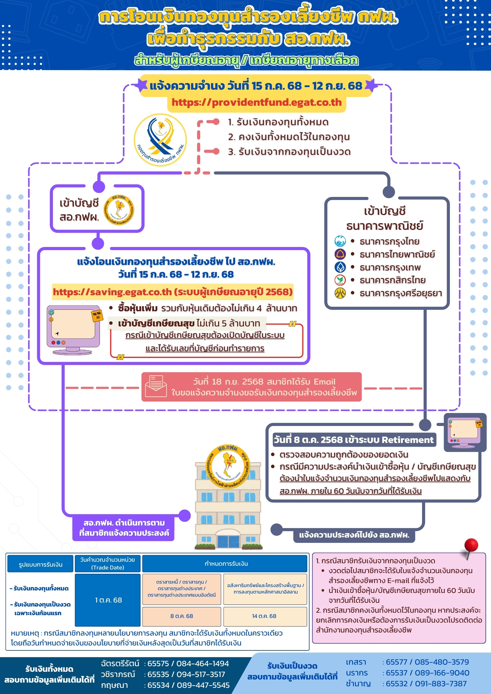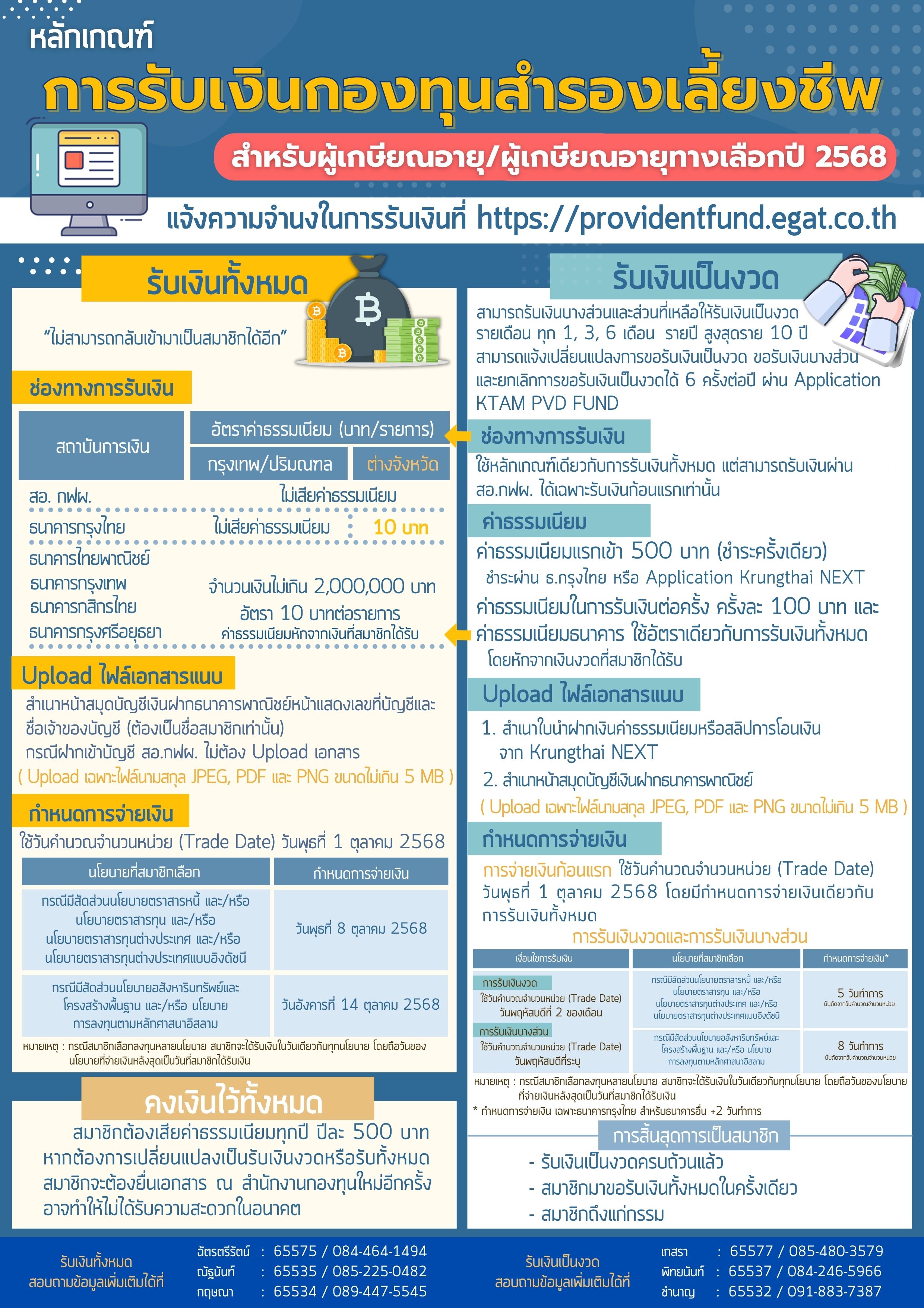 infographic หลักเกณฑ์การรับเงินกองทุนสำรองเลี้ยงชีพสำหรับผู้เกษียณอายุ / เกษียณอายุทางเลือกปี 2568